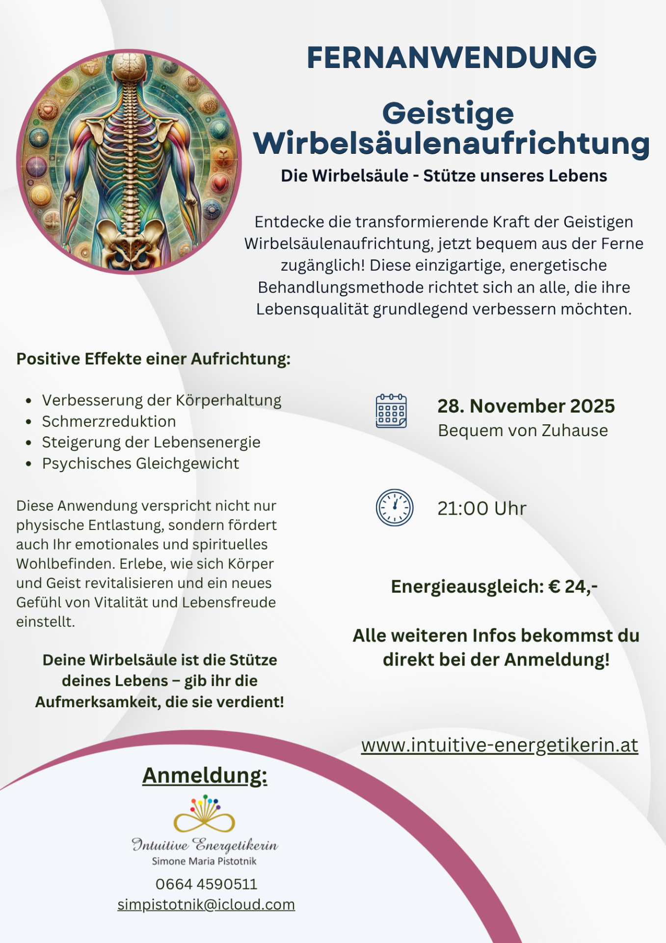 Die geistige Wirbelsäulenaufrichtung ist eine kraftvolle energetische Anwendung, die auf feinstofflicher Ebene Impulse zur Aufrichtung der Wirbelsäule und des gesamten Körpers setzt – ganz ohne körperliche Berührung.